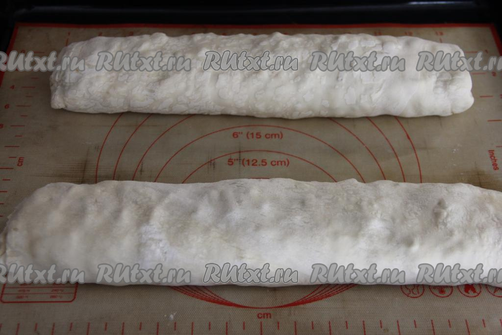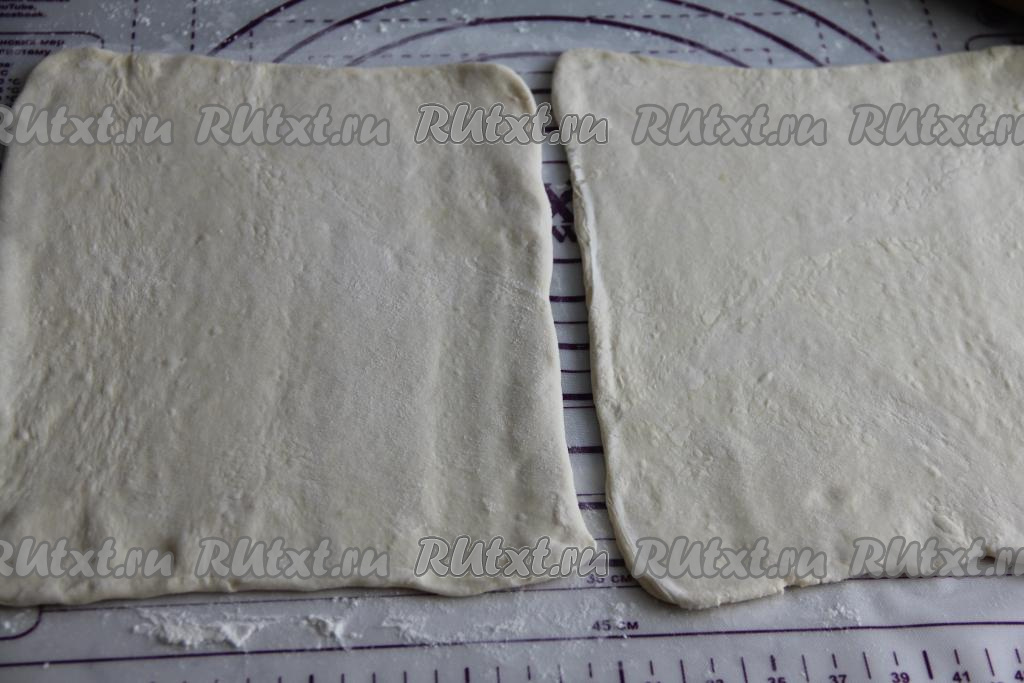У меня слоёное тесто в 2 пластах, поэтому я буду готовить 2 штруделя. На присыпанной мукой поверхности слегка раскатать каждый пласт теста в прямоугольник.