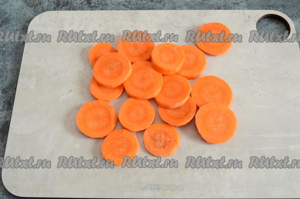 Морковку очистить и нарезать на кружочки (очень тонко нарезать не нужно, но и толстыми кружочки быть не должны, так как морковка в этом супе варится дольше других овощей).