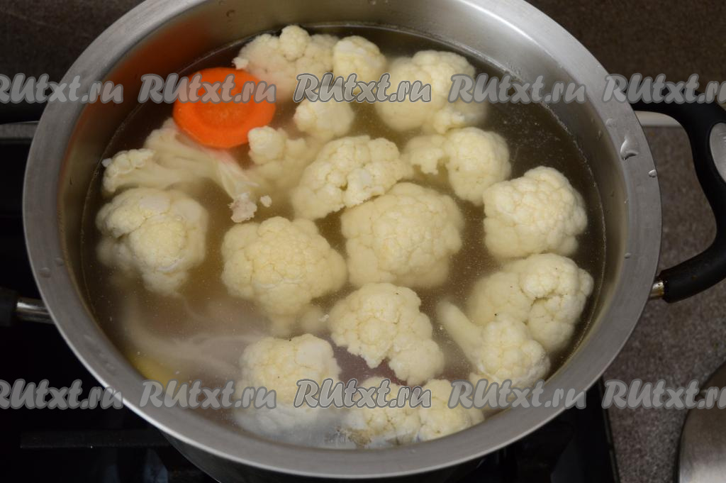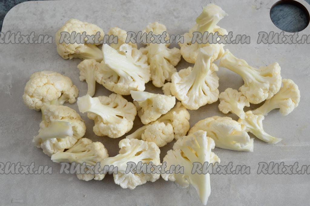 Цветную капусту промыть и разобрать на соцветия. Крупные соцветия можно разрезать ножом на части.