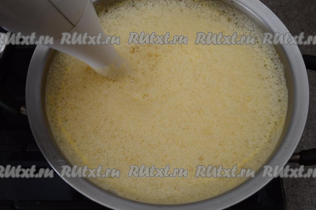 А затем пюрировать курино-овощной суп погружным блендером до однородности. Во время пюрирования суп начнёт пениться - это нормально, потом пена спадёт.