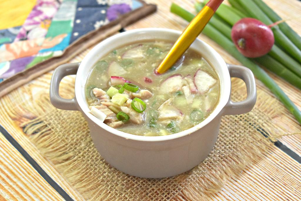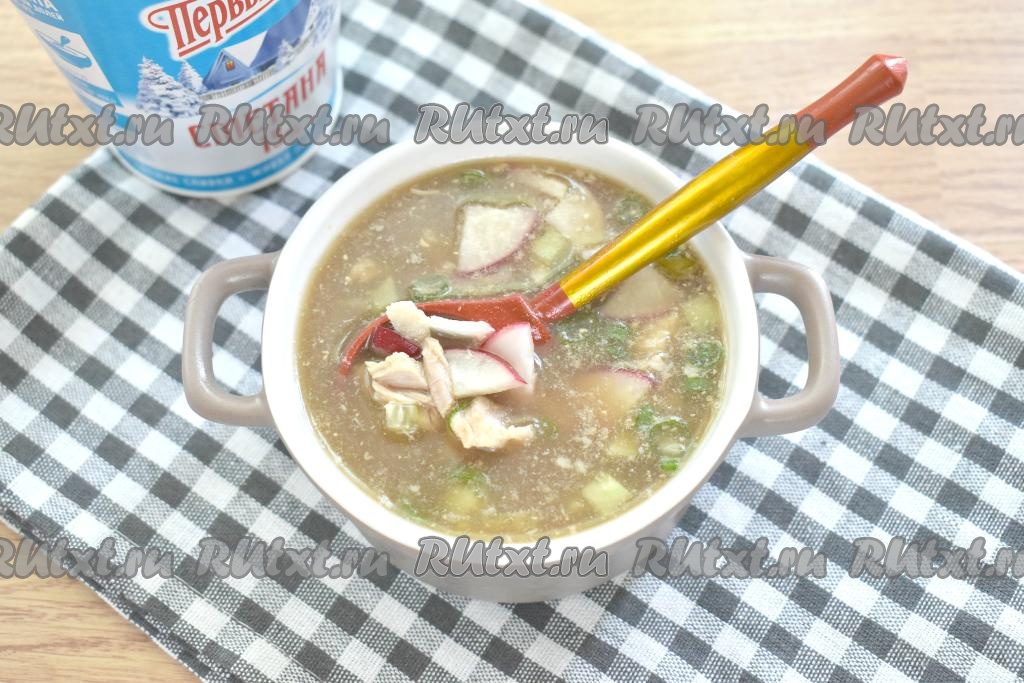 Окрошка, приготовленная со свининой на квасе, получилась сочной и вкусной, она прекрасно насытит и освежит в жаркий день.