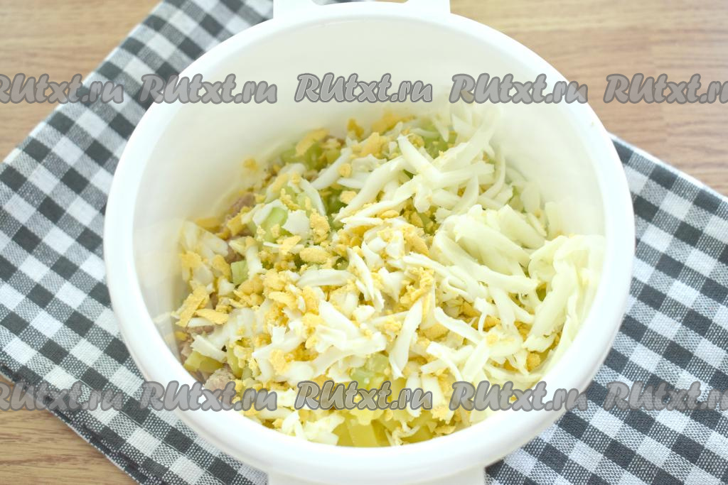 Яйца, сваренные заранее (в течение 10-11 минут с момента закипания), после остывания очищаем, натираем на крупной тёрке, добавляем в миску со свининой и овощами.