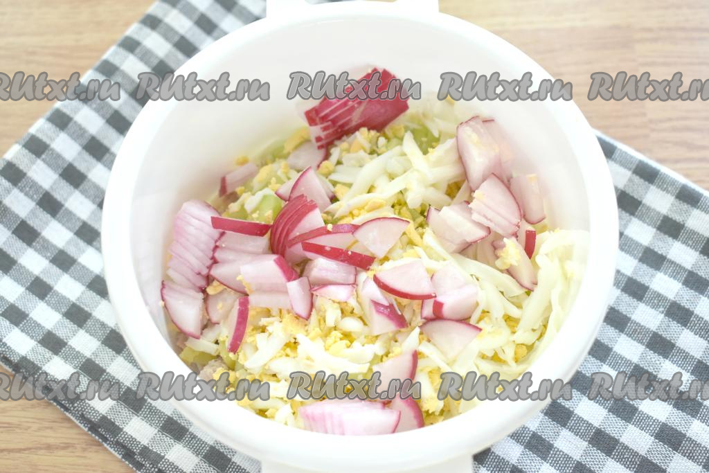 Тщательно промываем редис, срезаем хвостики. В зависимости от размера, нарезаем редиску на тонкие четверть кольца (или полукольца), добавляем в миску.