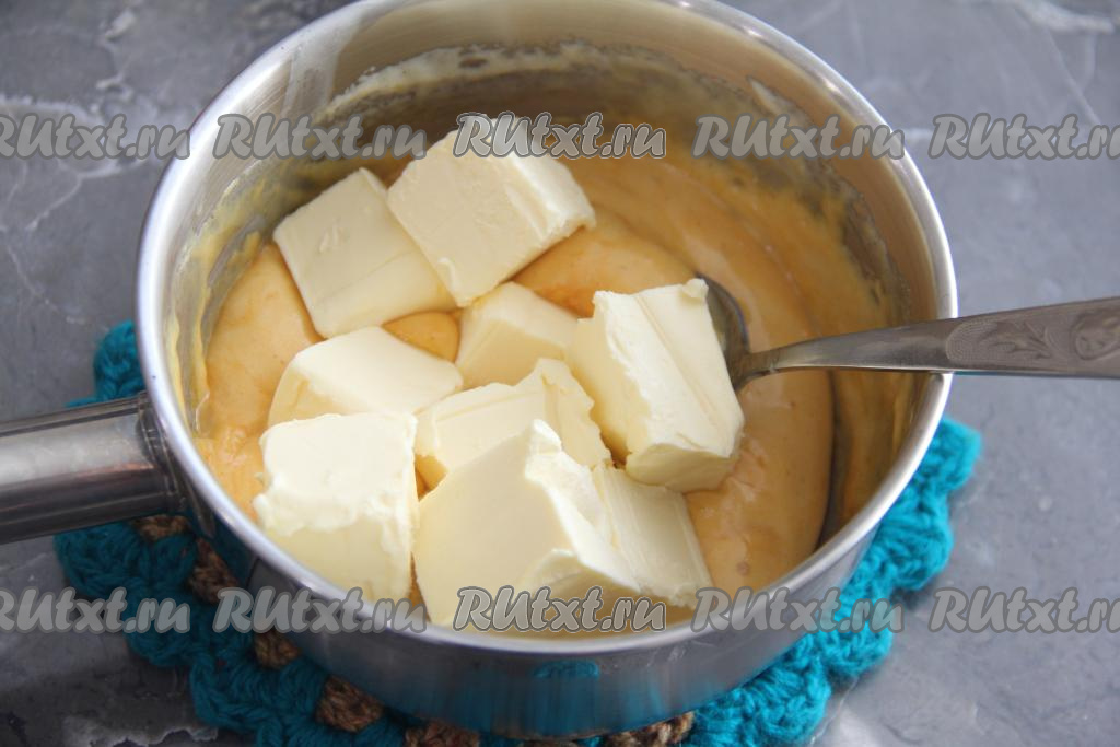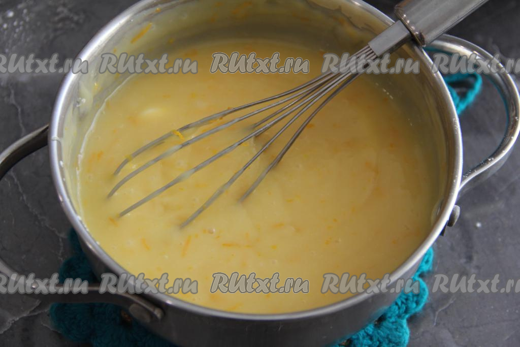 Апельсин хорошо вымыть и снять с него цедру (снимая оранжевую цедру, старайтесь не затрагивать, находящийся под ней белый слой). Убрать кастрюлю с огня. В горячий крем добавить апельсиновую цедру и кусочки сливочного масла комнатной температуры, перемешать венчиком до однородности.