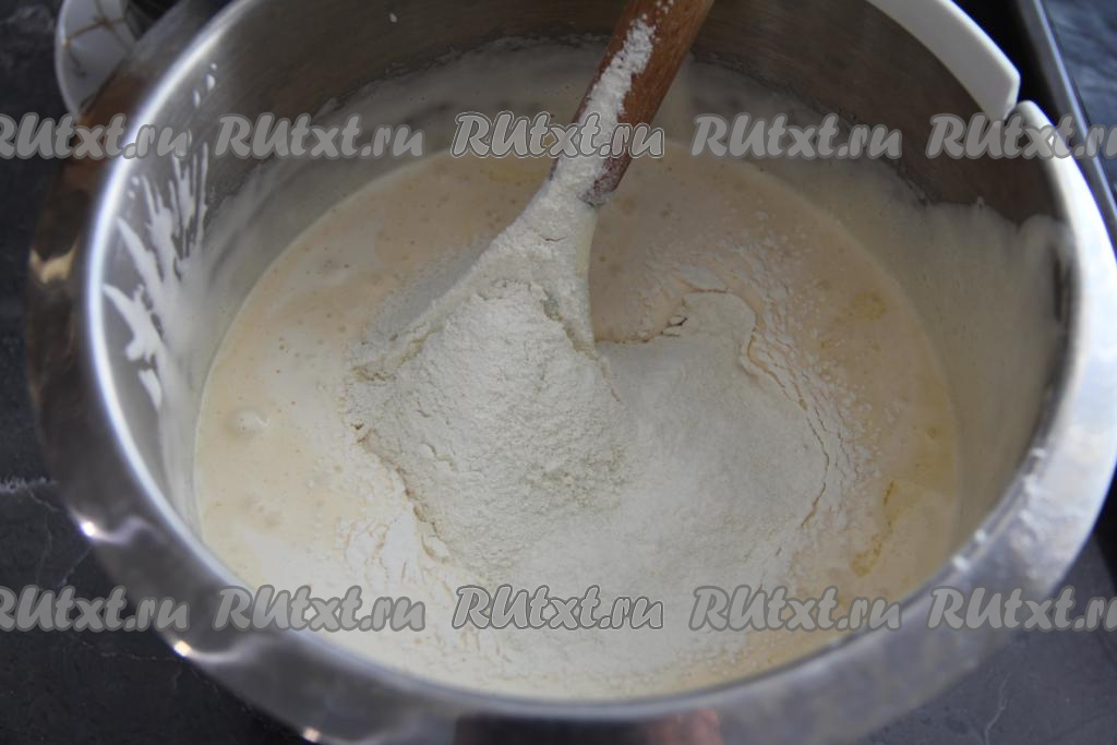 Добавить медово-масляную смесь в чашу со взбитыми яйцами и перемешать лопаткой до однородности. Затем в несколько приёмов всыпать просеянную муку, каждый раз тщательно вмешивая её в тесто.