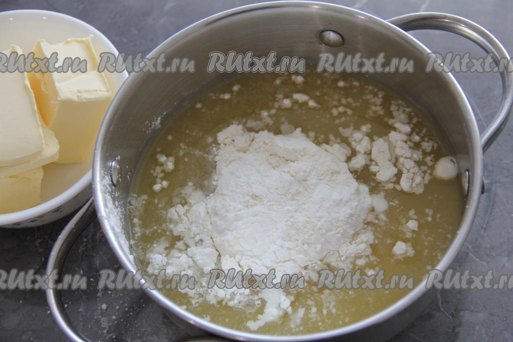 Снять медовую массу с огня и добавить кусочки сливочного масла комнатной температуры, очень хорошо перемешать (до полного растворения масла).
