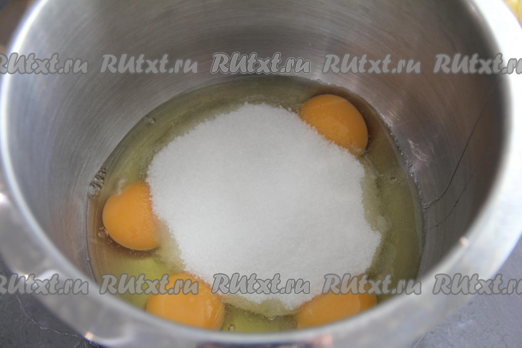 Взбить на высокой скорости миксера яйца с сахаром в течение 7 минут (до пышного и светлого состояния).