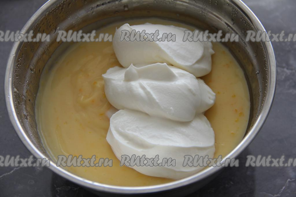 Накрыть апельсиновый крем пищевой плёнкой так, чтобы она лежала на поверхности крема - это не даст образоваться корочке на креме во время остывания. Оставить крем до полного остывания.