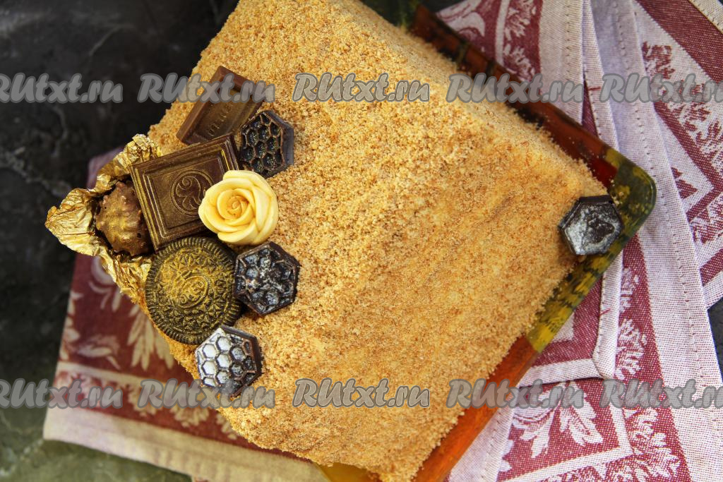 Обрезки перетереть в крошку и обсыпать ими верх и бока торта. Готовый медовик поставить в холодильник на ночь для пропитки. Я дополнительно украсила торт шоколадными конфетами перед подачей.
