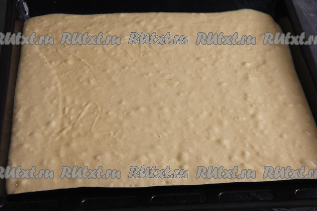 Противень застелить пергаментом (или ковриком для выпечки), выложить тесто и разровнять. У меня квадратный противень размером 30 на 30 сантиметров, поэтому медовик получается квадратным. Если у вас прямоугольный противень, значит получится прямоугольный торт.