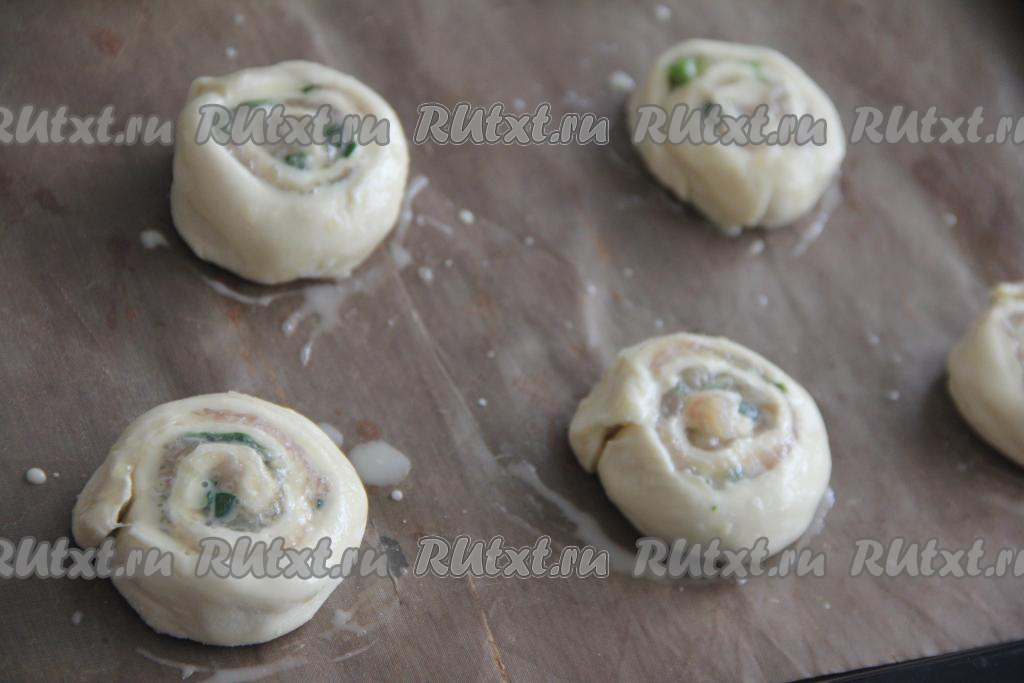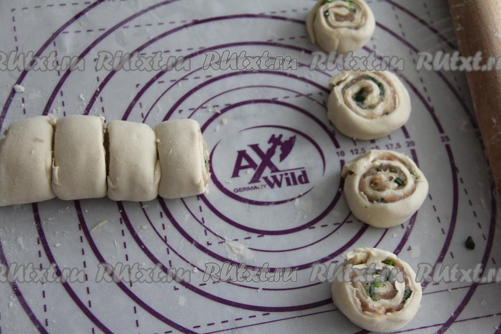 Выложить заготовки слоёных рулетиков срезом вверх на расстоянии друг от друга на противень, застеленный ковриком (или пергаментом) для выпечки.