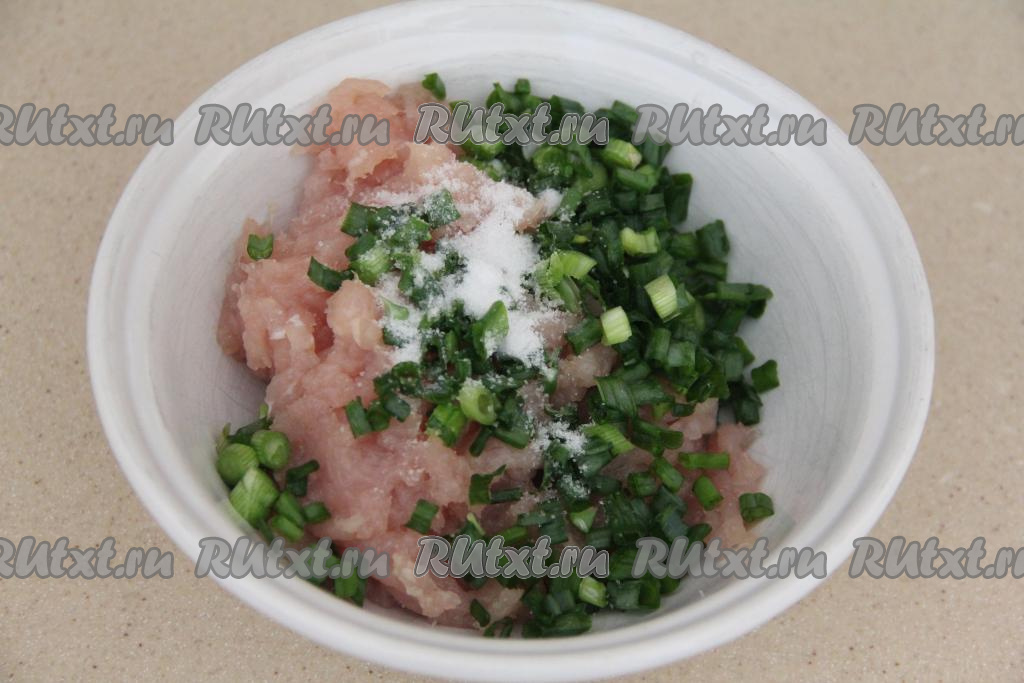Разморозить слоёное тесто при комнатной температуре. Мясной фарш выложить в миску. Зелёный лук (или другую зелень) вымыть, мелко нарезать, переложить к фаршу, посолить, перемешать и начинка для рулетиков готова.