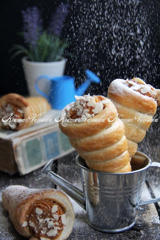 Аппетитные, очень вкусные трубочки из слоёного теста, приготовленные с варёной сгущёнкой, по желанию, посыпать сахарной пудрой (можно украсить ещё миндальными лепестками) и подать к чаю или кофе.