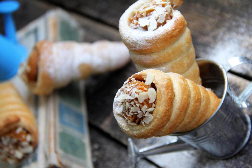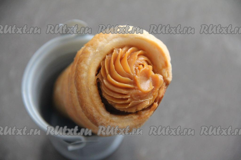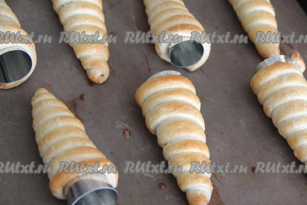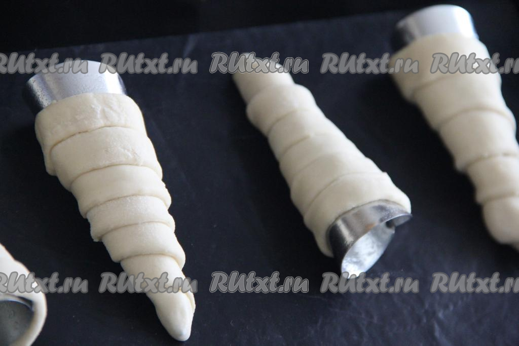 Трубочки можно сформировать с помощью металлических конусов, которые можно купить в магазине для кондитеров. Если таких конусов нет, тогда можно сформировать конусы из пищевой фольги. Конусы смазать растительным маслом и обмотать полосками теста. Полосочки должны плотно прилегать друг к другу, не внахлёст. Переложить заготовки слоёных трубочек на противень, застеленный ковриком для выпечки (или пекарской бумагой).