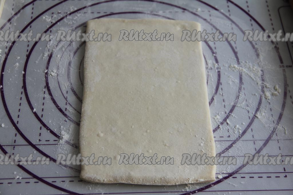 Слоёное тесто (у меня - бездрожжевое) разморозить при комнатной температуре. Затем на припылённой мукой поверхности слегка раскатать скалкой пласт теста в одном направлении. Не нужно тонко раскатывать тесто.