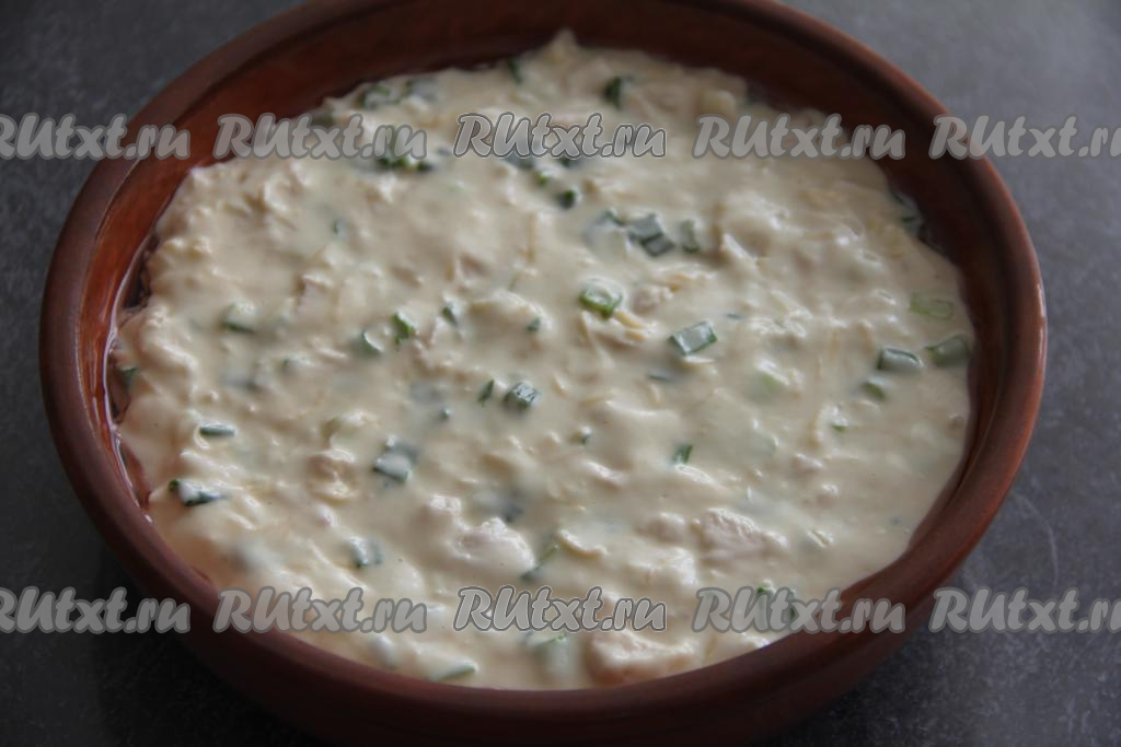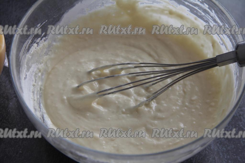Тесто для этого заливного пирога не должно быть очень густым, по консистенции будет напоминать сметану средней густоты.