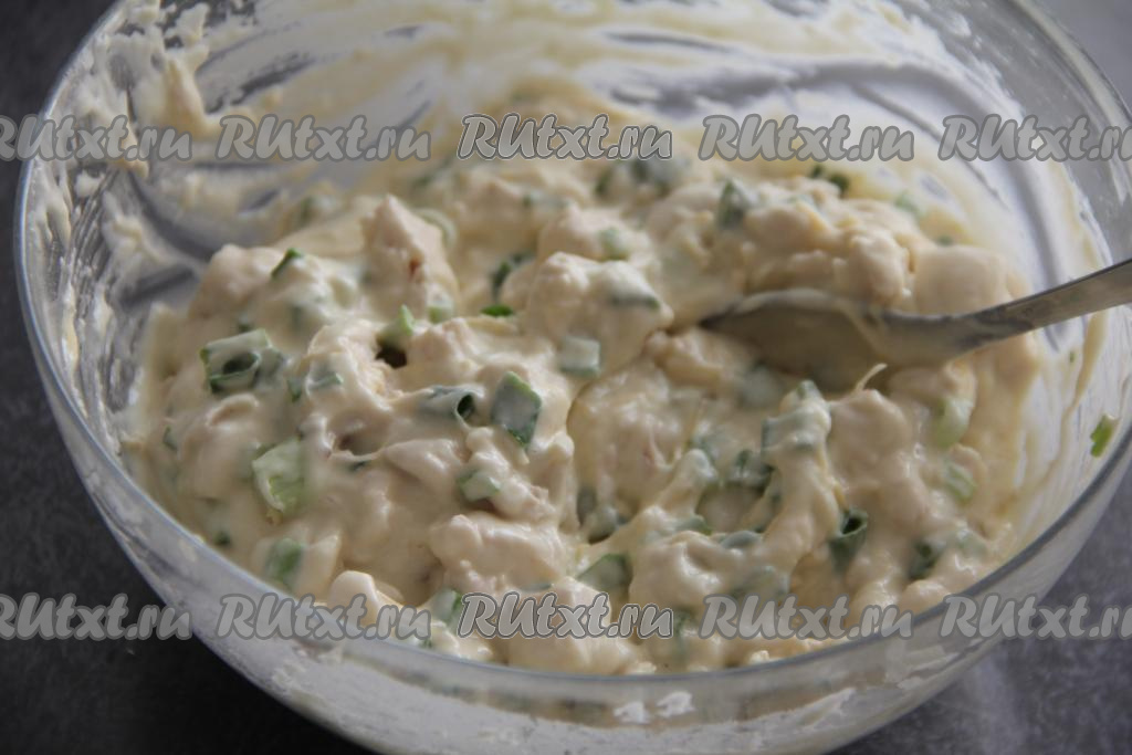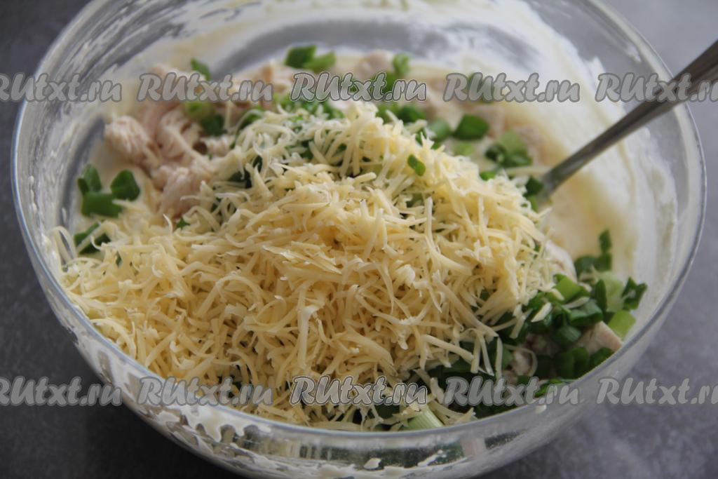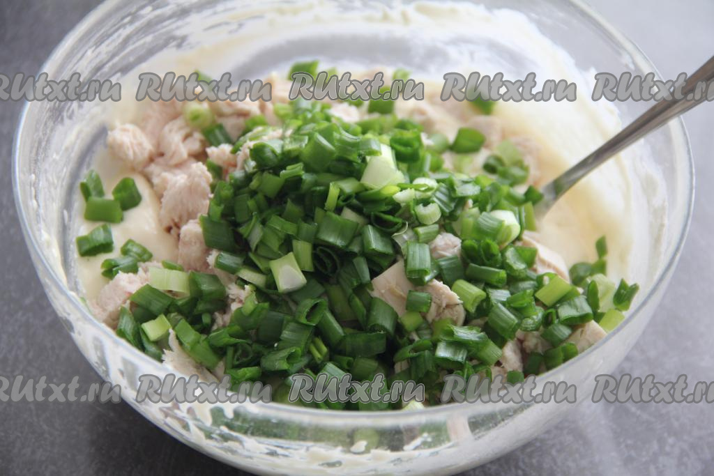 Затем в тесто с курицей добавить нарезанный зелёный лук, перемешать.