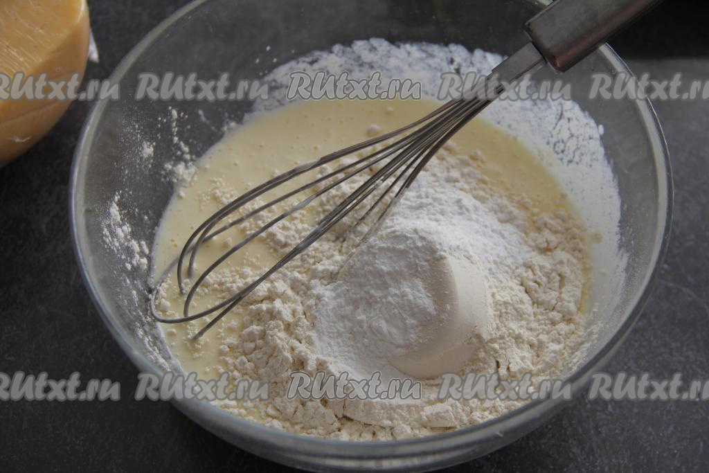Всыпать разрыхлитель, частями добавить муку, каждый раз тщательно перемешивая тесто венчиком.