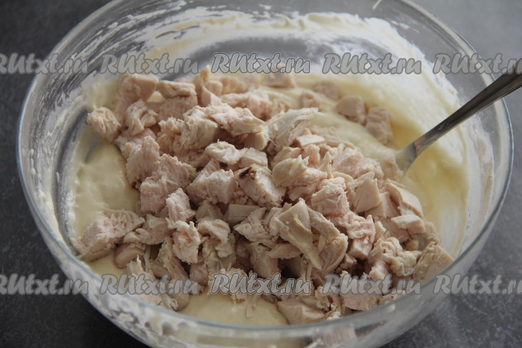 Остывшее куриное мясо нарезать на кубики размером 1 на 1 сантиметр, добавить в тесто и перемешать ложкой.