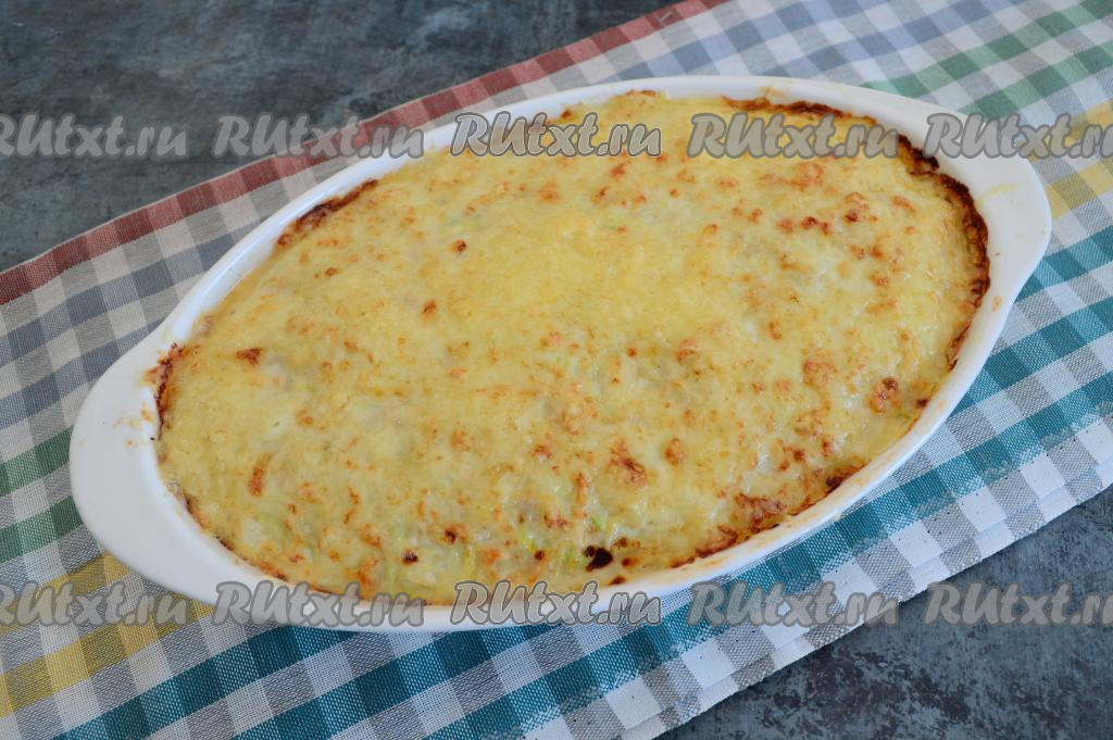 Отправить запеканку из кабачков с индейкой обратно в духовку на 10 минут (фольгой не накрывать). Запекать до румяности сыра.