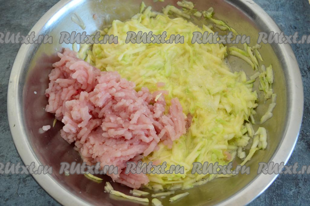 Перемешать кабачки с яйцами. Пропустить филе индейки через мясорубку, посолить получившийся фарш и выложить в миску со смесью кабачков и яиц, перемешать.