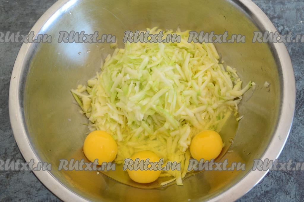 В глубокую миску натереть очищенные кабачки на крупной тёрке. Всыпать соль по вкусу и вбить сырые яйца.