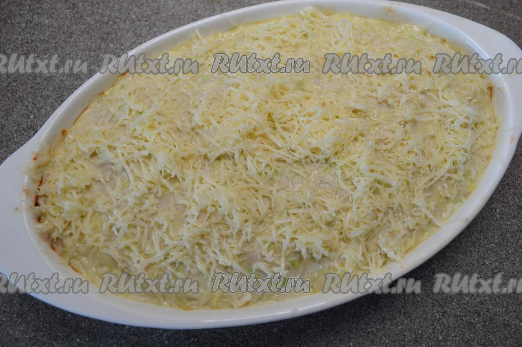 По истечении 40 минут запеканку из кабачков с индейкой достать из духовки. Оставшиеся 50 грамм сыра натереть на средней тёрке и посыпать им верх запеканки.