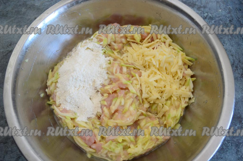 50 грамм твёрдого сыра натереть на крупной тёрке и вместе с мукой добавить к кабачкам и индейке, тщательно перемешать столовой ложкой. Масса для приготовления запеканки должна получиться достаточно густой и вязкой, но многое зависит от сочности кабачков и величины яиц. Если масса всё же получилась жидковата, тогда добавьте совсем немного муки. Я больше 2 столовых ложек муки обычно не добавляю.