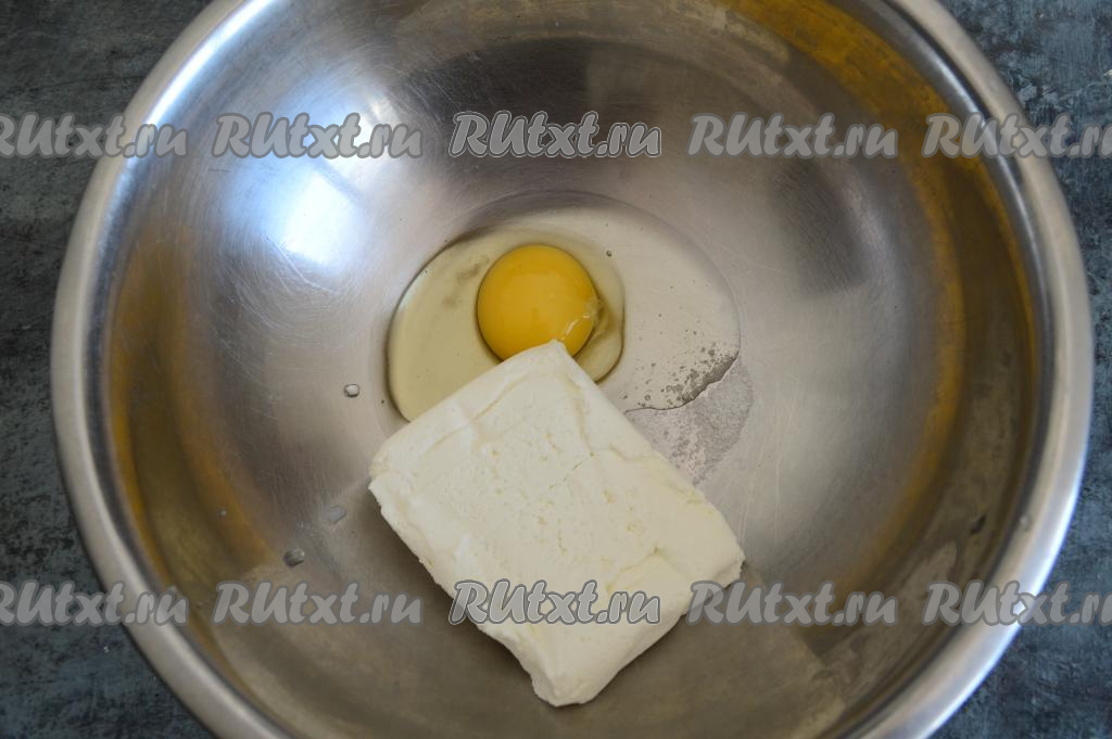 В миску вбить сырое яйцо, всыпать соль и выложить творог.