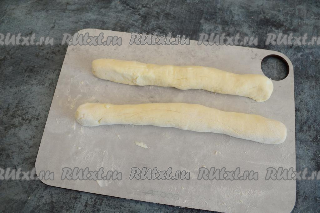 Разделить замешанное творожное тесто на две части. На припылённой мукой поверхности скатать 2 колбаски.