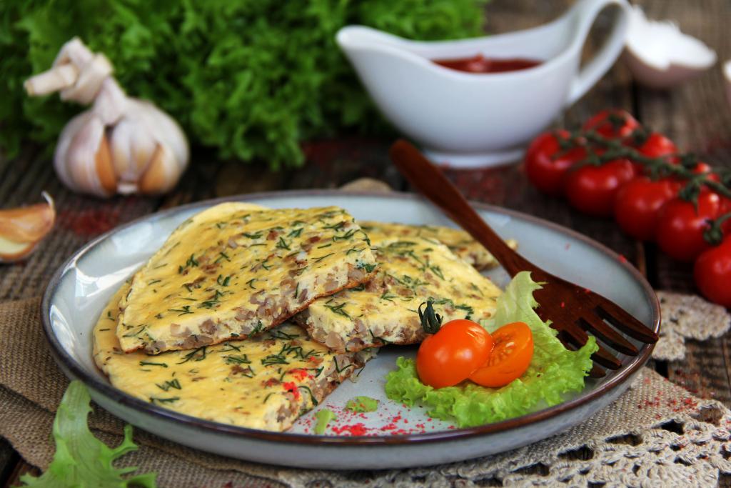 На завтрак за считанные минуты можно приготовить вкусный, аппетитный омлет из яиц и гречки. Это блюдо станет сытным началом дня. Для приготовления омлета можно взять гречку, оставшуюся с обеда или ужина. В качестве дополнения к этому блюду можно подать свежие овощи и любимый соус. Просто, сытно и вкусно, попробуйте!