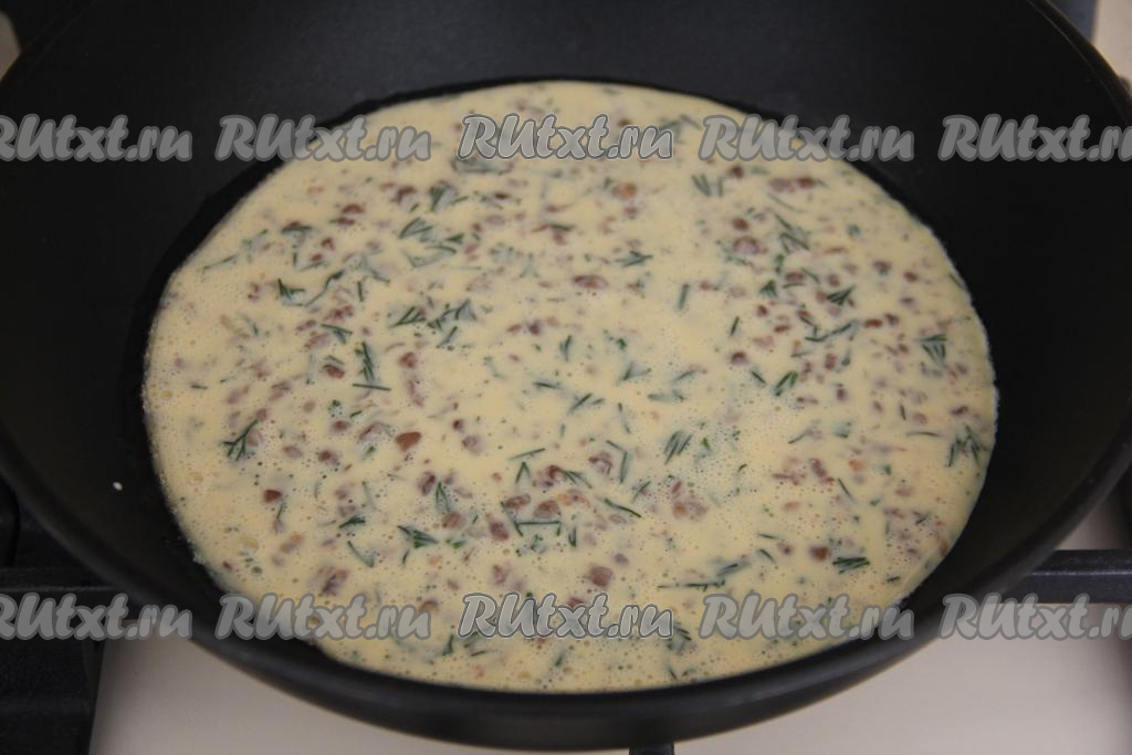 В сковороду влить немного растительного масла и хорошо разогреть. Затем в сковороду влить яично-гречневую массу, равномерно распределить и накрыть крышкой. Жарить омлет с гречкой на медленном огне минут 5-7 (верх омлета должен стать достаточно сухим, без влажных вкраплений).