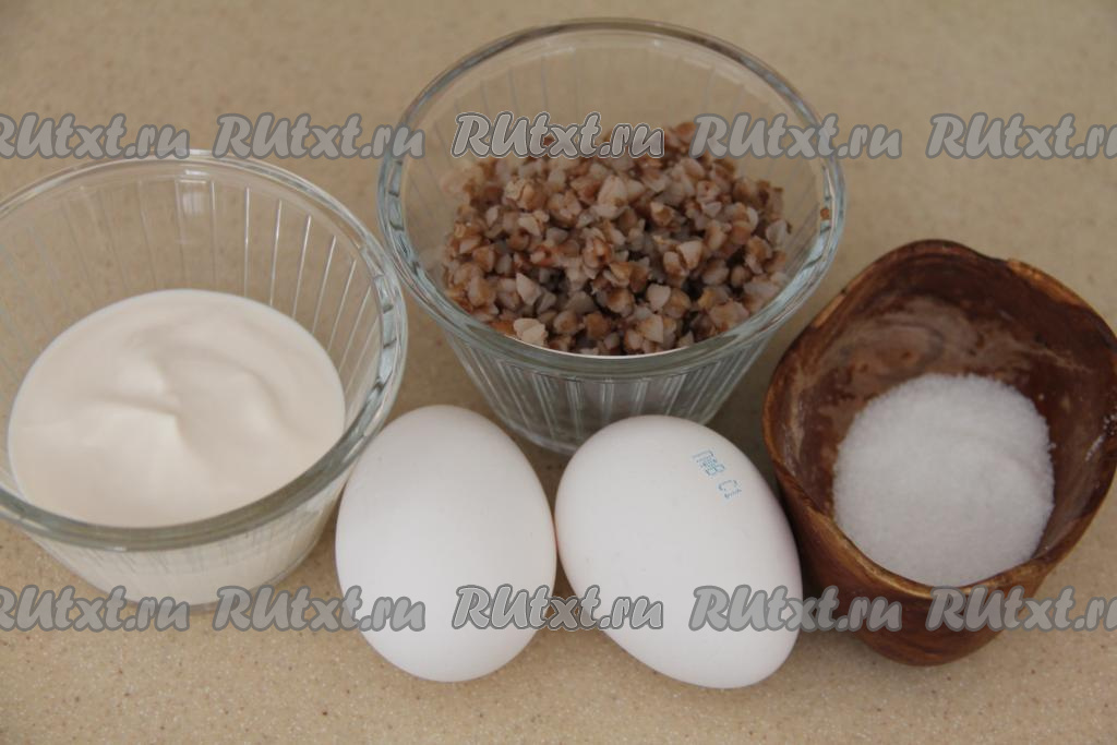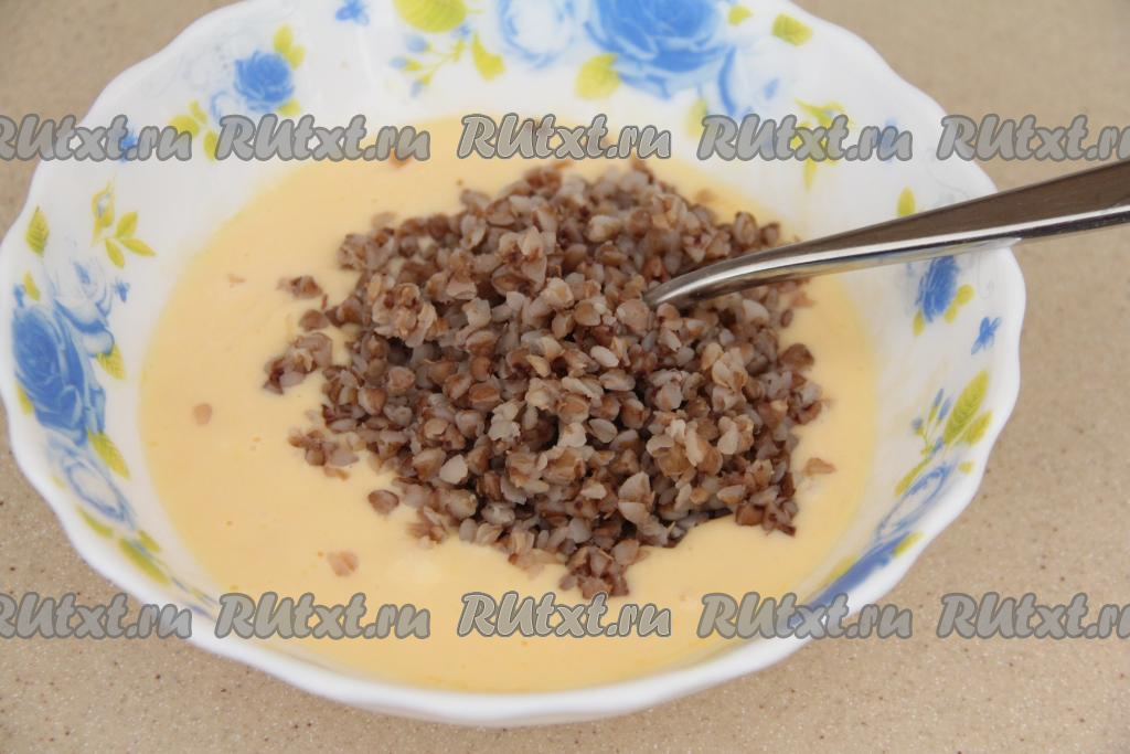 С помощью вилки перемешать яйца со сметаной (или молоком) до однородности. Затем всыпать варёную гречку, перемешать.