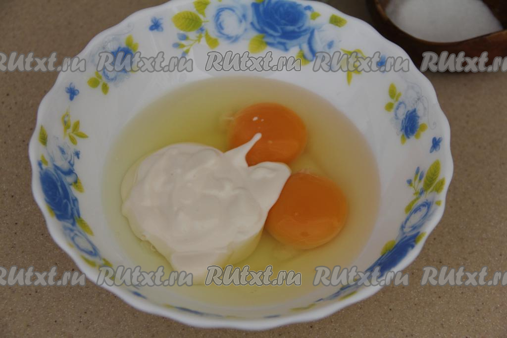 В миске соединить яйца, соль и сметану (или молоко).