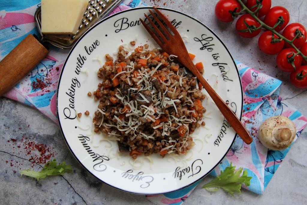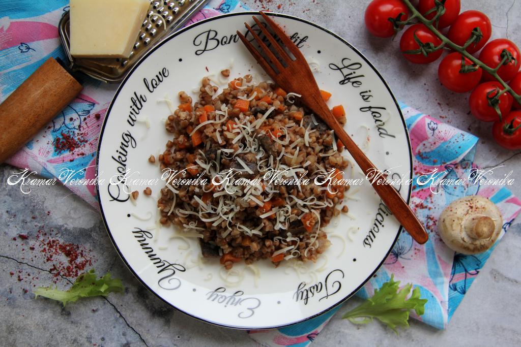 Сочетание гречки и грибов - удачное, поэтому это простое блюдо, приготовленное на сковороде, получается очень вкусным и сытным. К столу подаём в горячем виде. Перед подачей, по желанию, можно посыпать натёртым сыром.