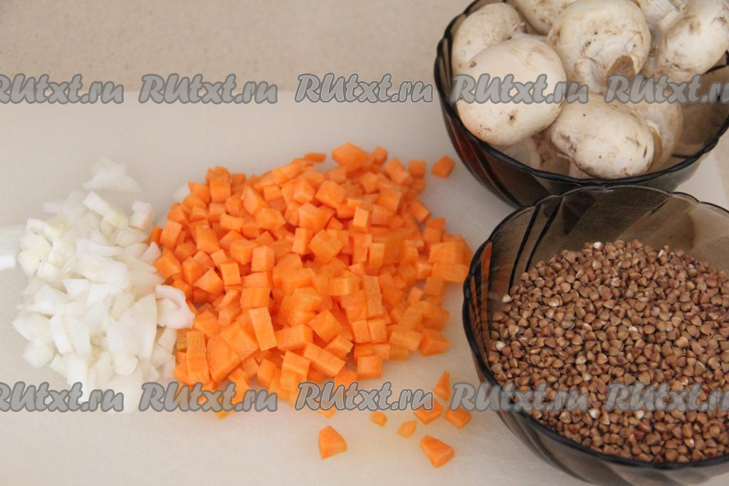 Подготовить продукты. Лук и морковь почистить. Лук мелко нарезать. Морковь нарезать на маленькие кубики (или натереть на крупной тёрке). Шампиньоны промыть водой, нарезать на пластины. Вместо шампиньонов можно взять лесные грибы, предварительно отваренные в течение 25-30 минут с момента закипания воды, затем лишнюю воду нужно будет слить, дать остыть грибочкам, а после этого нарезать их на части. Если же будете готовить со свежими вешенками, тогда промойте их водой и нарежьте. Гречку, если необходимо, перебрать, а затем выложить в сито и тщательно промыть водой, дать стечь лишней воде.