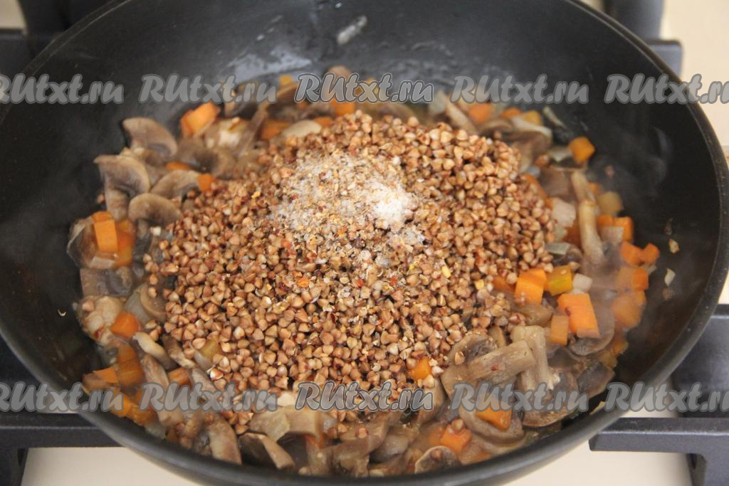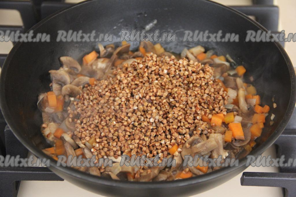 Обжарить грибы с овощами в течение 5 минут, не забывая время от времени помешивать, затем добавить гречку.