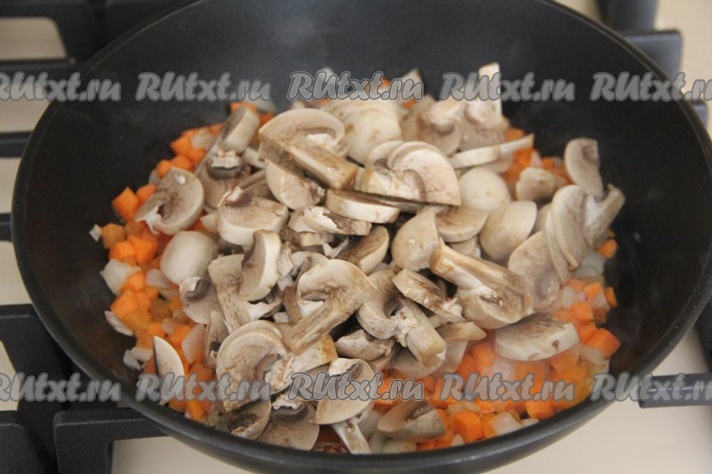 В сковороду с обжаренными овощами выложить шампиньоны (или подготовленные лесные грибы, или вешенки), перемешать.
