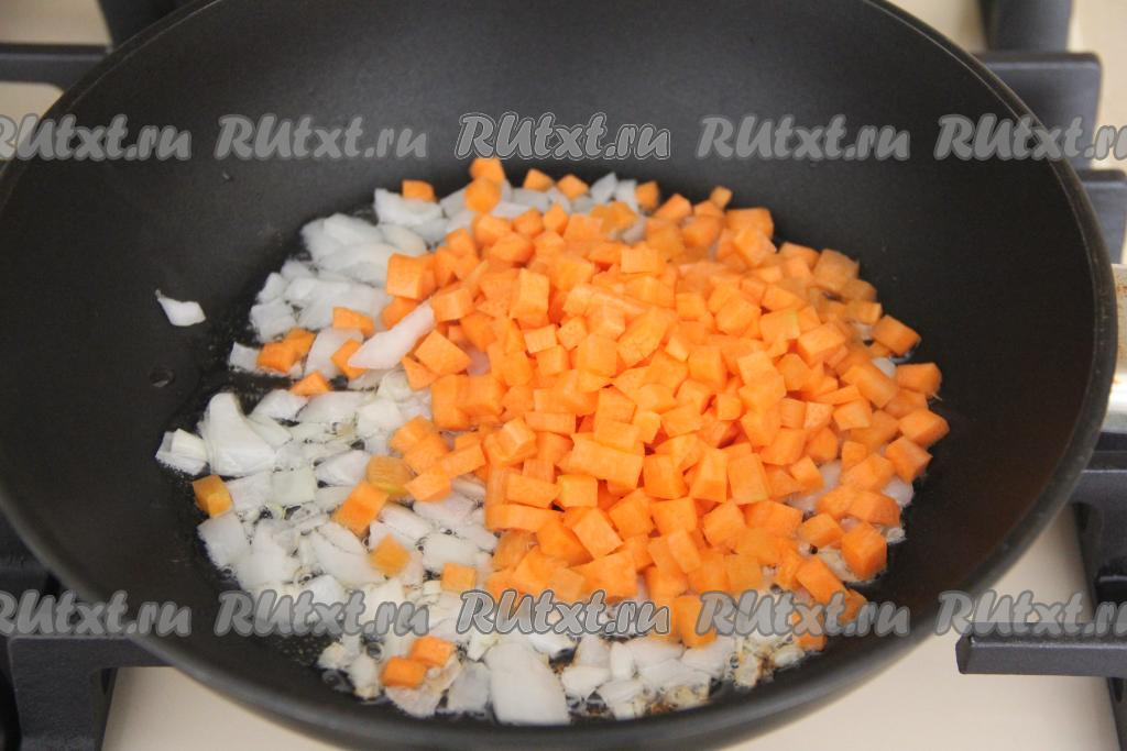 Затем выложить морковь, перемешать и обжаривать овощи вместе 4-5 минут, периодически помешивая.