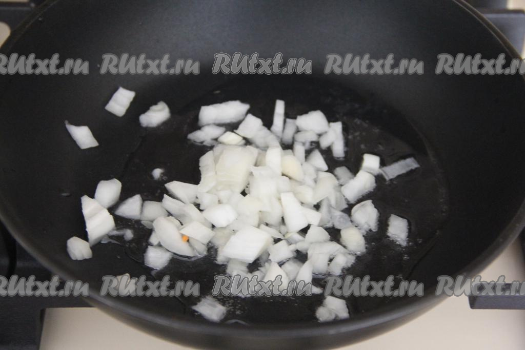 Разогреть в сковороде растительное масло, затем выложить лук и обжарить его на среднем огне, помешивая, в течение 3-4 минут.