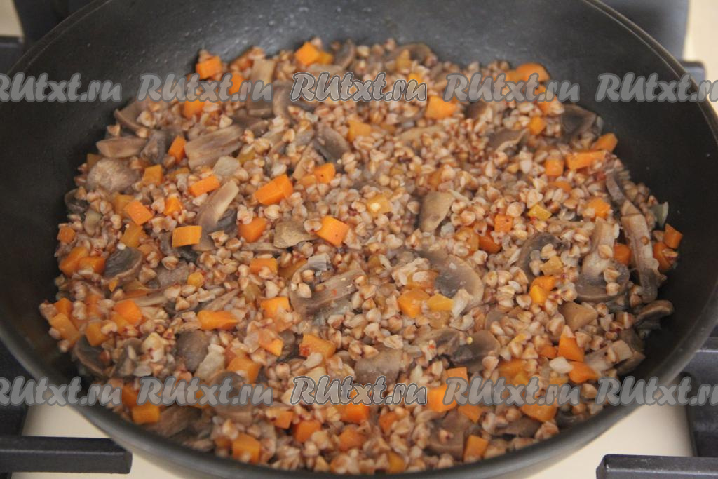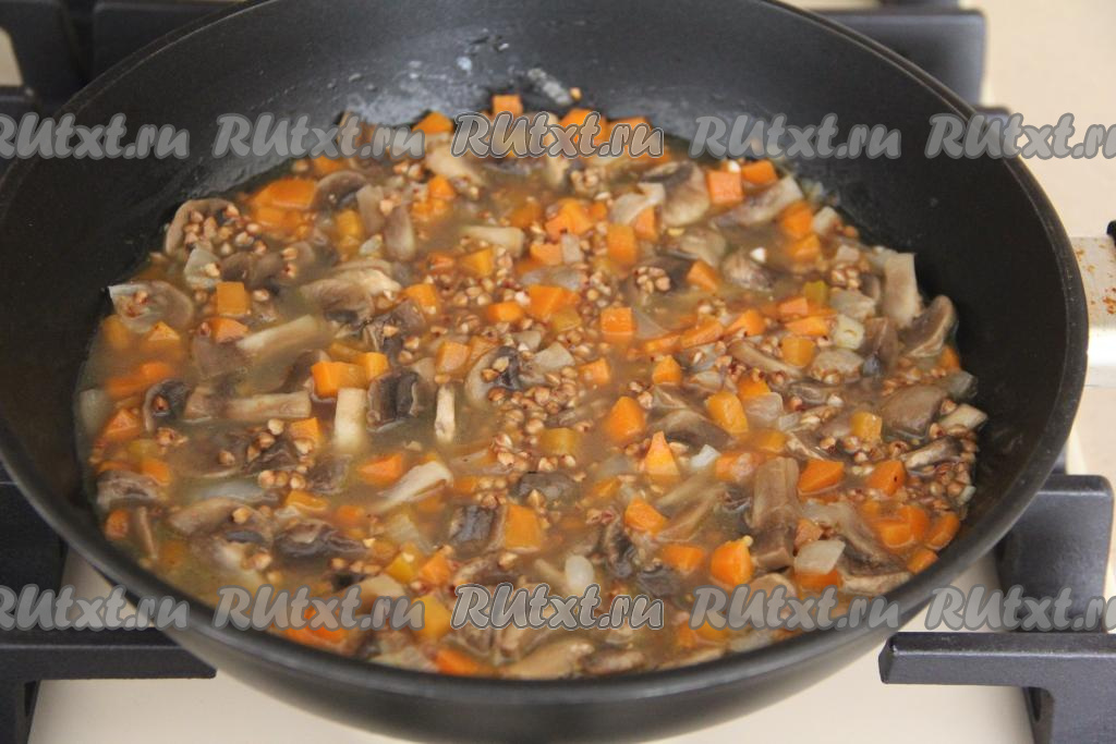 Накрыть сковороду крышкой и томить гречку с грибами, морковью и луком на медленном огне до полного испарения воды (минут 20-25), затем убрать с огня, перемешать.