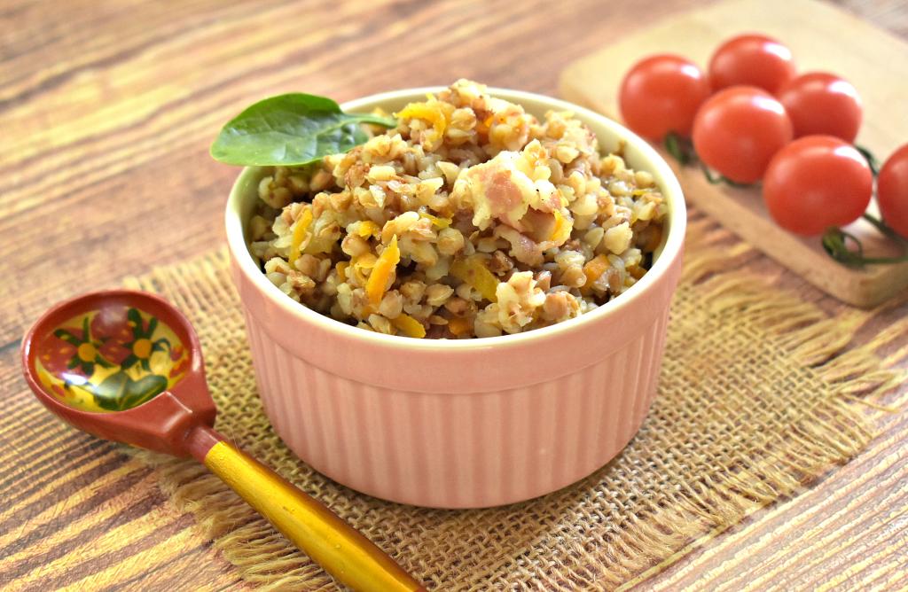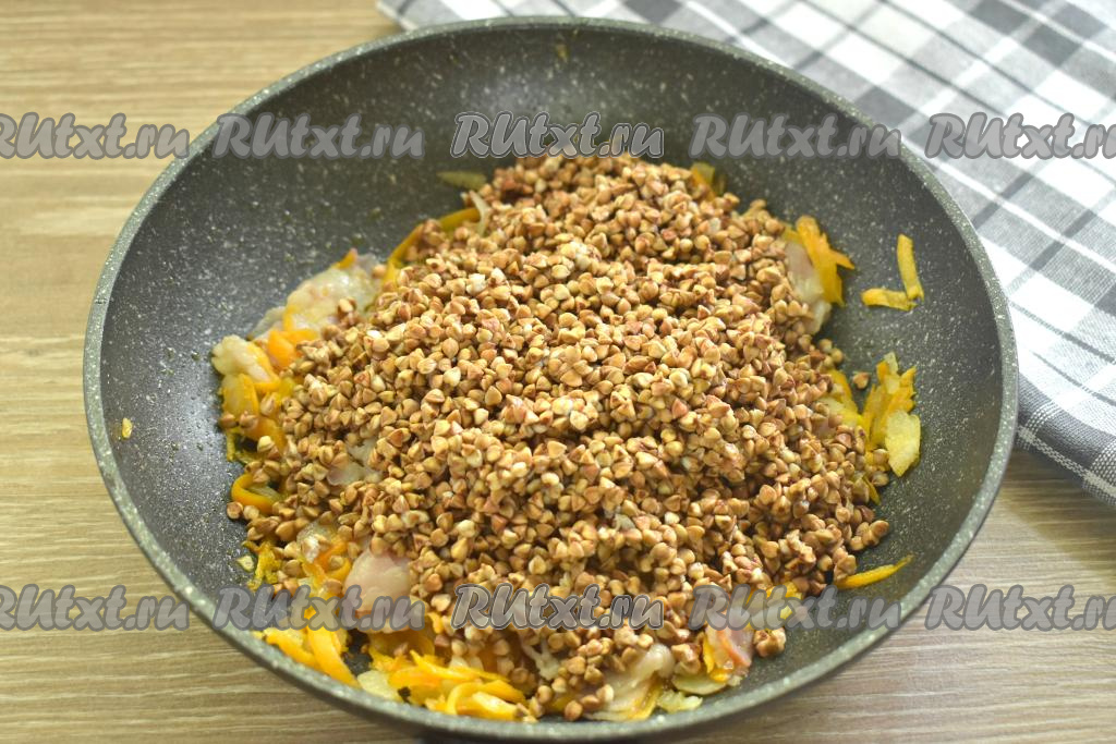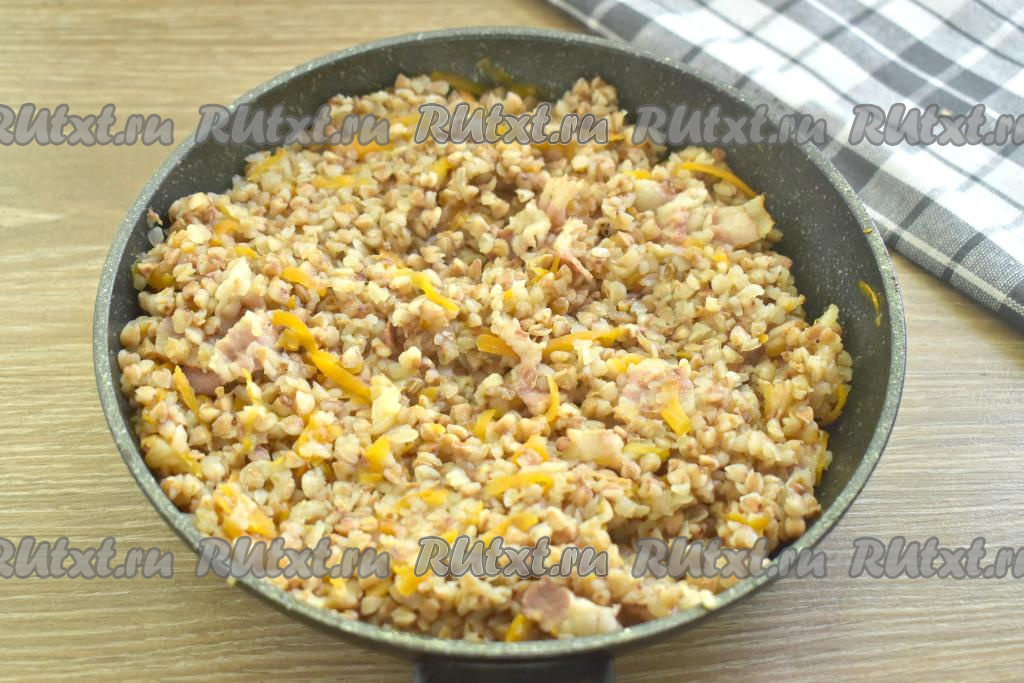 Подготовленную гречневую крупу добавляем к бекону с овощами на сковороду.