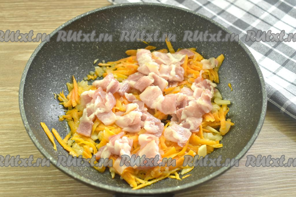 Полоски сырокопчёного бекона нарезаем на кусочки и добавляем на сковороду с обжаренными овощами, перемешиваем. Обжариваем 2-3 минуты, время от времени помешивая.