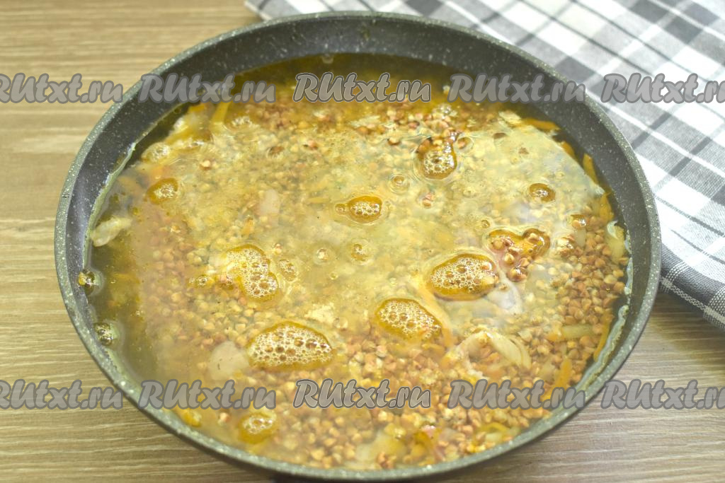 Как только вода закипит, убавляем огонь до минимума. Сковороду накрываем крышкой. Варим гречневую кашу с беконом на сковороде 20 минут (до испарения воды).