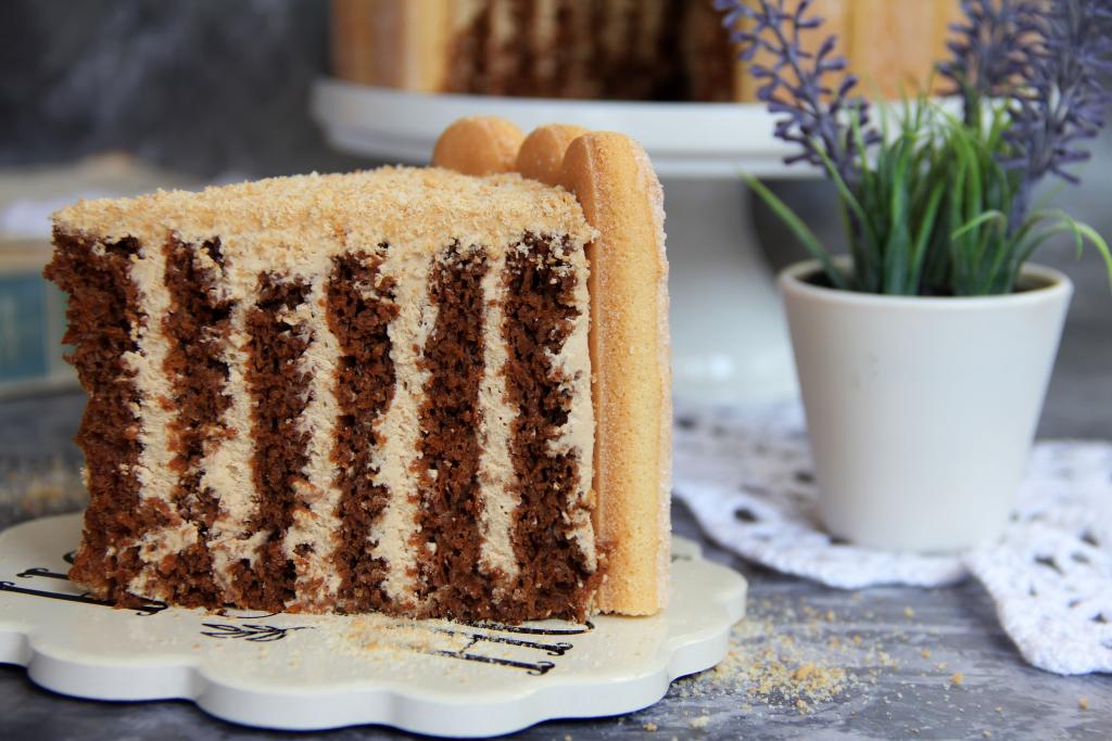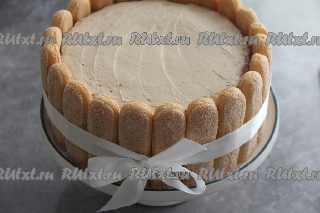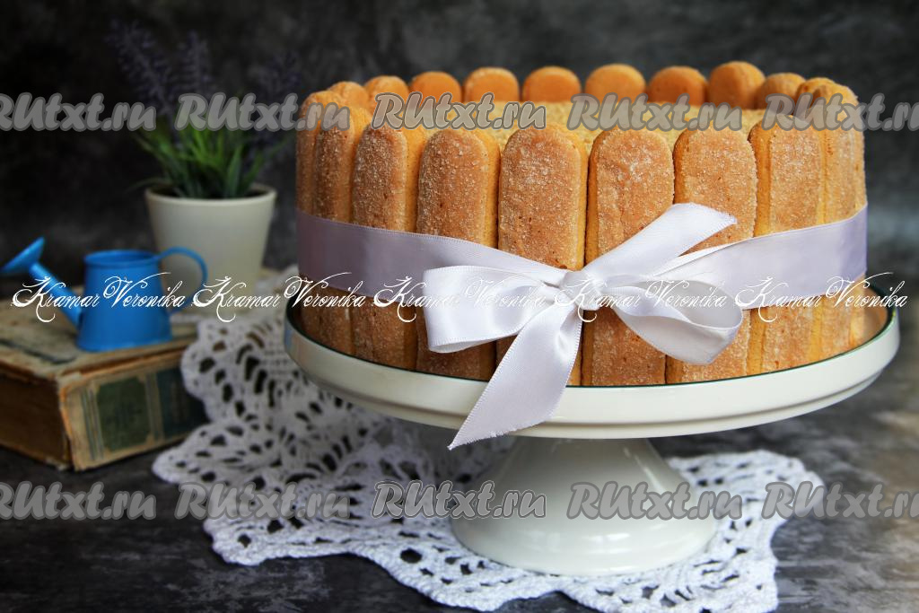 Готовый торт можно обсыпать кокосовой стружкой или измельчёнными орехами. Я украсила печеньем "Савоярди", получилось очень аккуратно.