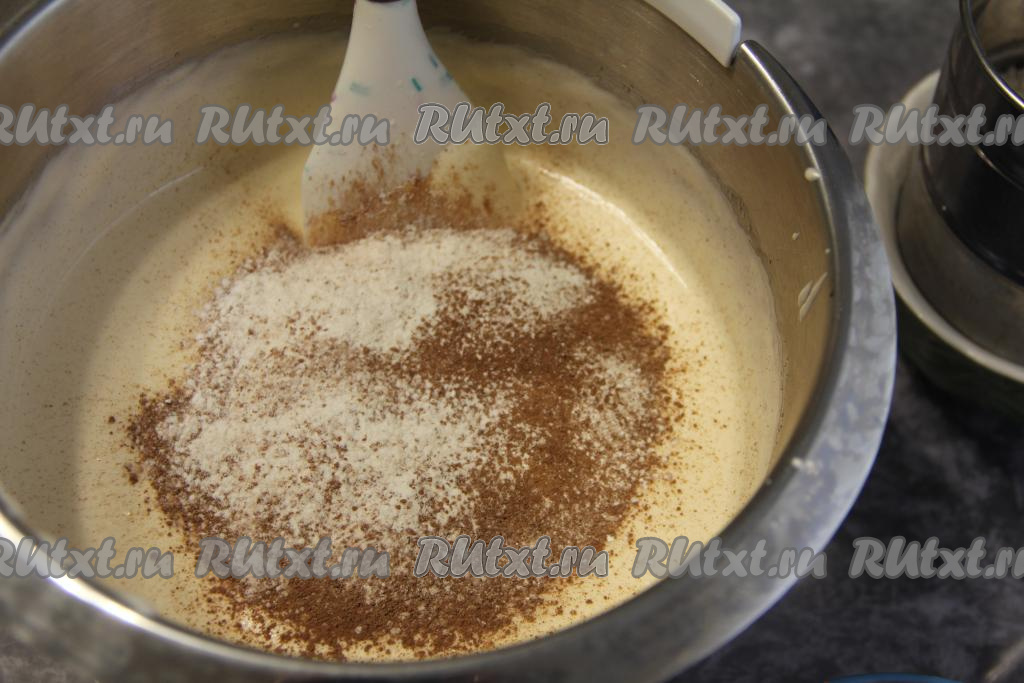 Миксером взбить яйца с сахаром в течение минут 5-7 (до пышного состояния). Затем добавить какао, крахмал и соль, частями начать всыпать просеянную муку, перемешивая тесто для коржа лопаткой движениями снизу вверх. Добавляя муку, учитывайте, что тесто должно получиться в меру густым и воздушным.