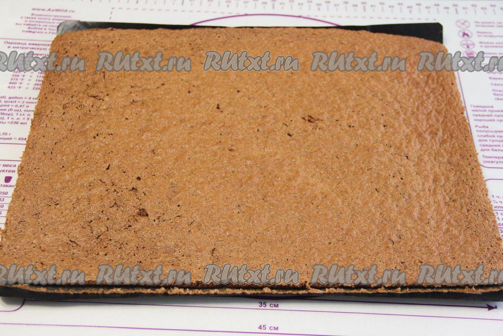 Выпекать шоколадно-морковный корж минут 20 в духовке, заранее разогретой до 180 градусов. Готовность проверить, проколов сухой зубочисткой (если бисквит полностью готов, значит зубочистка и после прокалывания коржа останется чистой и полностью сухой). Достать корж из духовки, дать немного остыть, после этого убрать с противня и оставить до полного остывания.