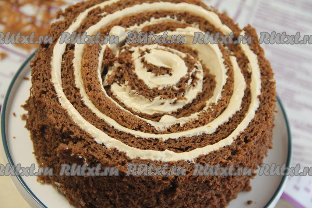 Можно разрезать корж на три широких полоски и сложить их друг на друга, у вас получится прямоугольный тортик. Я решила приготовить торт в виде улитки. Для этого корж, смазанный кремом, разрезать на 4 полоски. Свернуть вначале одну полоску, смазанную кремом, в улитку и поставить на плоскую тарелку.