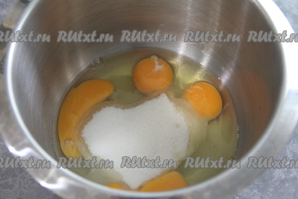 Прежде всего испечём бисквитный корж, для этого в чаше миксера нужно соединить яйца, ванильный сахар и обычный сахар.