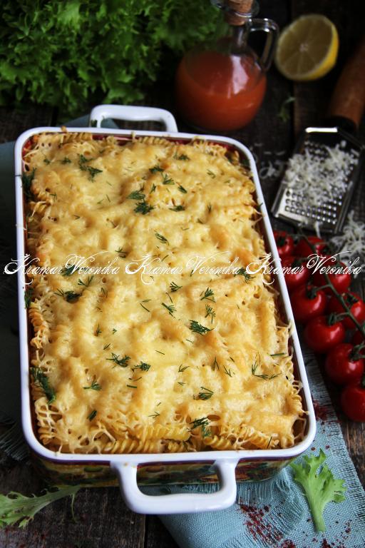 Равномерно залить макароны с фаршем получившейся смесью из сливок и яиц. Сверху присыпать макароны натёртым сыром. Форму накрыть фольгой и поставить в духовку, разогретую до 200 градусов, минут на 30.